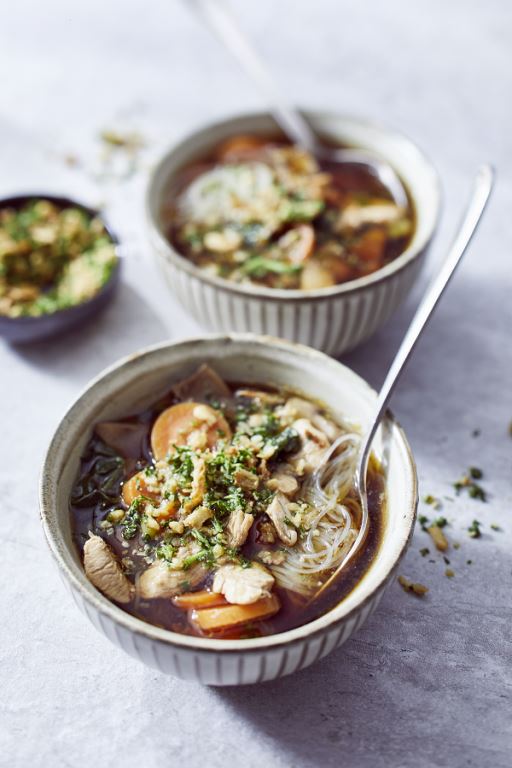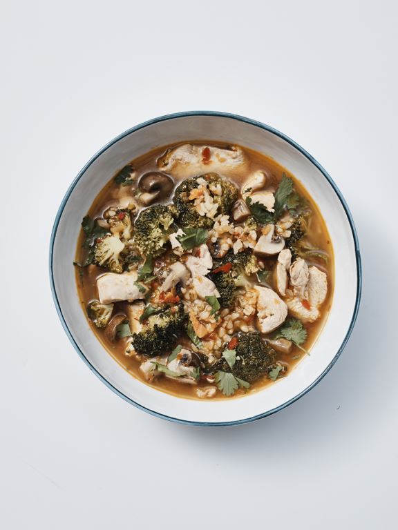 6. Do ugotowanych warzyw dodać pieczarki, brokuły, sos sambal oelek i kaszę bulgur, ponownie gotować kolejne 10 minut. Ugotowanego na parze kurczaka przełożyć do misek, uzupełnić zupą do pełna, udekorować liśćmi kolendry i podawać bezpośrednio po przygotowaniu.