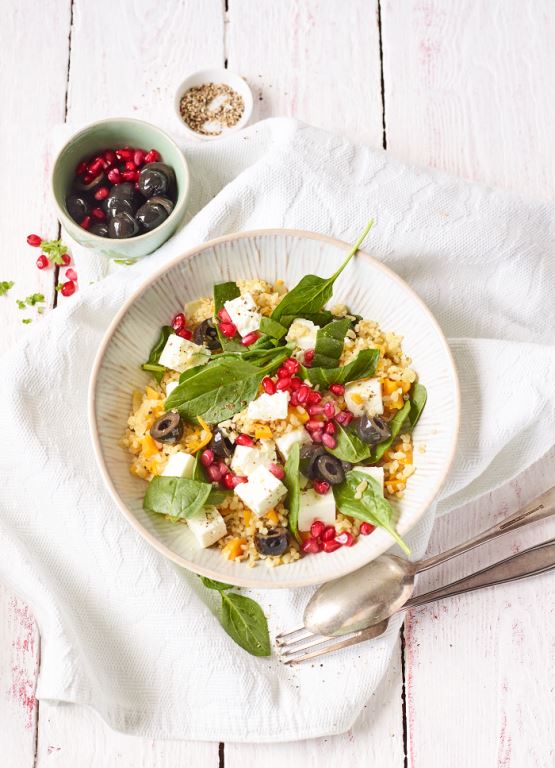 Rozgrzewka za nami ? czas na danie główne! Dobrym pomysłem będą różne zdrowe zapiekanki jak na przykład zapiekanka z kaszy gryczanej z cukinią, serem feta, udekorowana kolorem miłości, czyli pomidorkami koktajlowymi. W jadłospisie wszystkich dbających o dietę zwykle nie brakuje lekkich sałatek, więc i w menu walentynkowym może dla nich znaleźć się miejsce. Idealnie sprawdzą się sałatki z dodatkiem owoców granatu, który nie dość, że jest bardzo zdrowy ? bogaty w selen, potas, miedź, cynk), to jeszcze zaliczany jest do naturalnych afrodyzjaków. Naszą pierwszą propozycją jest sałatka z kaszą bulgur, granatem, migdałami, marchewką i ziołowym pesto. Druga opcja ? także z kaszą bulgur to sałatka z dodatkiem szpinaku, sera feta i czarnych oliwek.