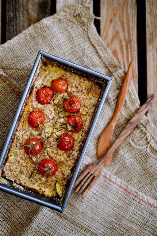 5. Dodać ugotowaną kaszę, jajko, ser feta, zioła prowansalskie, pieprz i sól, wymieszać. Masę przełożyć do przygotowanej wcześniej formy, na wierzchu ułożyć pomidorki koktajlowe i przykryć folią aluminiową.